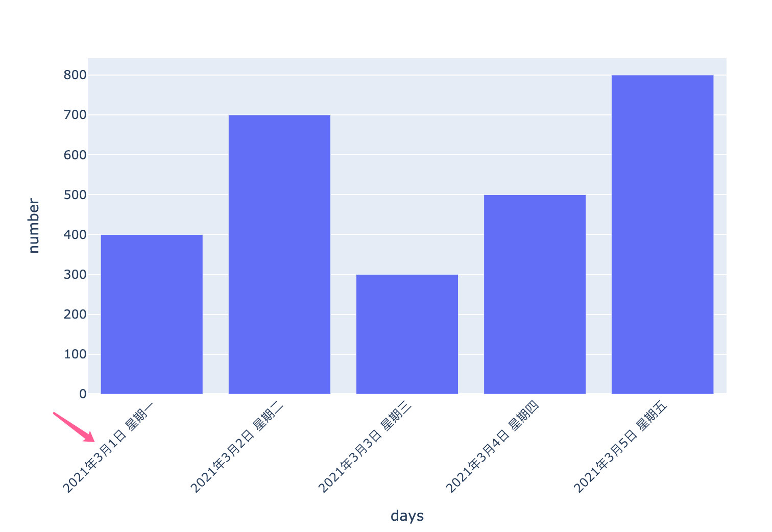 information = pd.DataFrame({"days":["2021年3月1日 星期一","2021年3月2日 星期二","2021年3月3日 星期三","2021年3月4日 星期四",ß"2021年3月5日 星期五"],"number":[400,700,300,500,800]