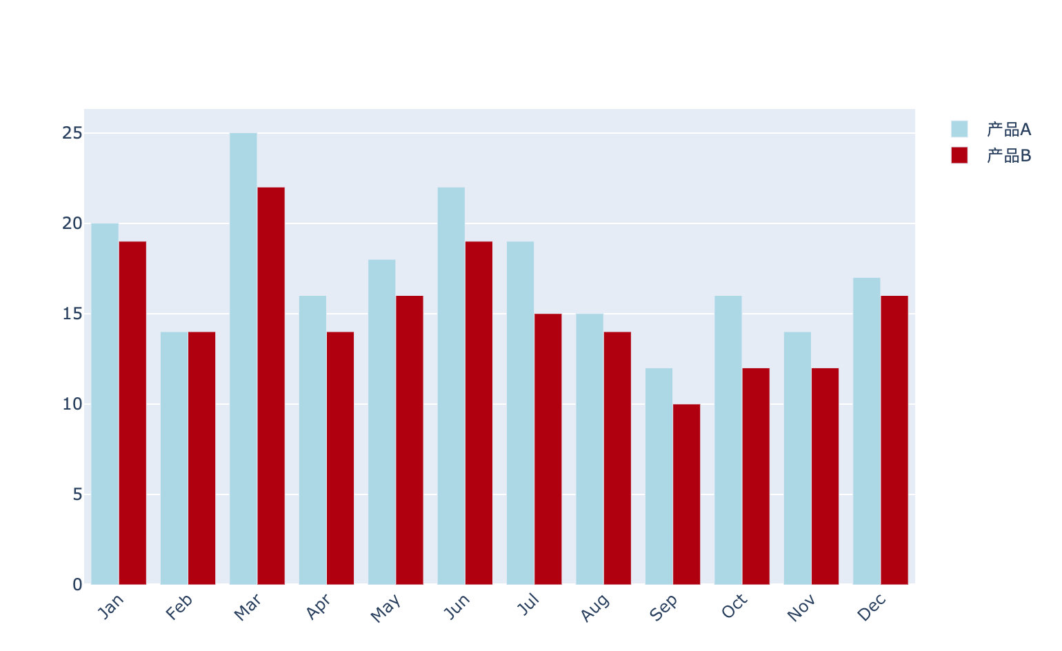 fig.add_trace(go.Bar(x=months,y=[20, 14, 25, 16, 18, 22, 19, 15, 12, 16, 14, 17],name='产品A',marker_color='lightblue' # 颜色的不同表示方法