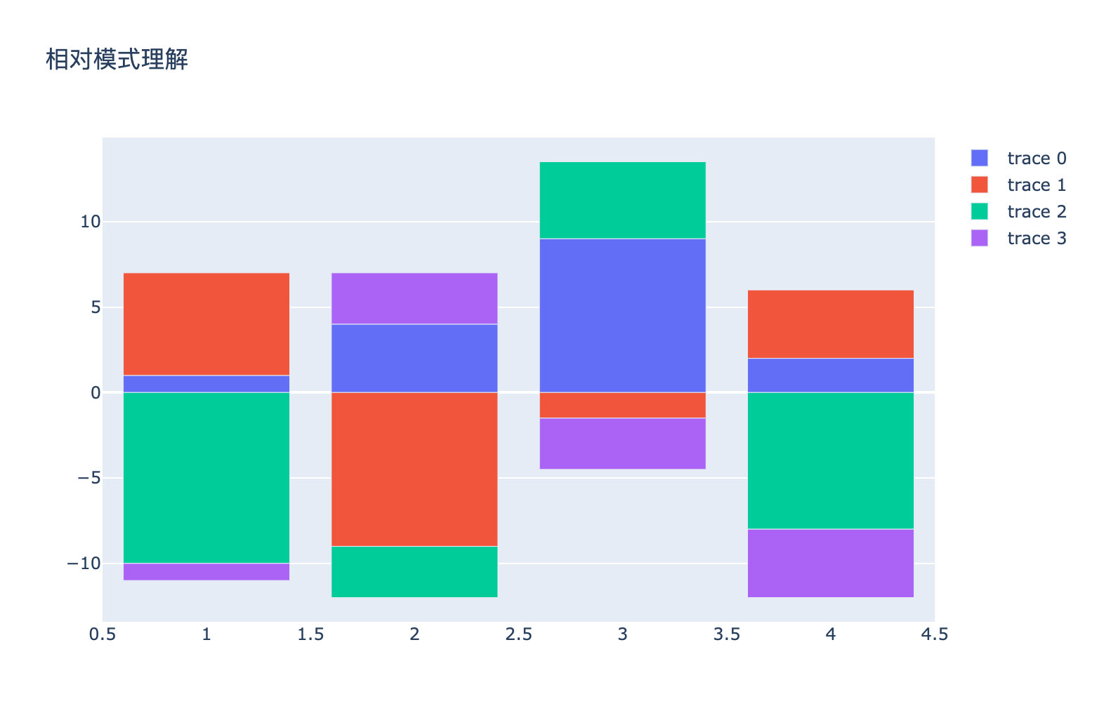 fig.add_trace(go.Bar(x=x, y=[-1, 3, -3, -4]))fig.update_layout(barmode='relative', # 相对初始位置title_text='相对模式理解')fig.show()