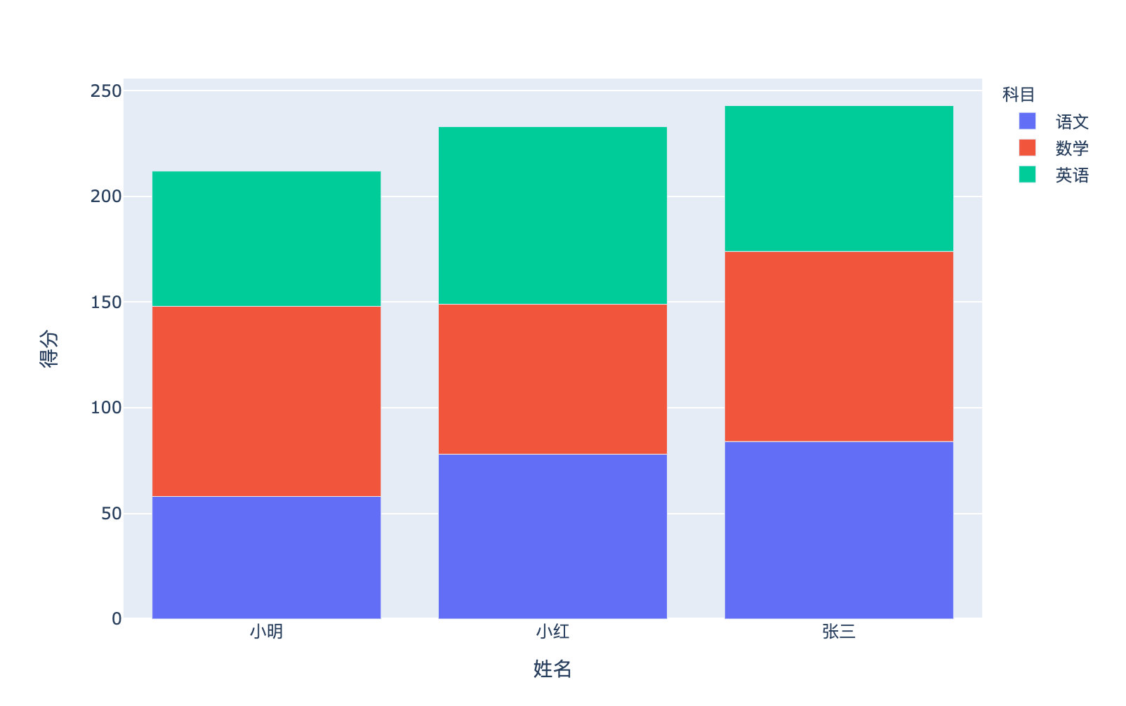 fig = go.Figure(data=[go.Bar(name='小明', x=["语文","数学","英语"], y=[120, 104, 93]),go.Bar(name='小红', x=["语文","数学","英语"], y=[101, 88, 109])