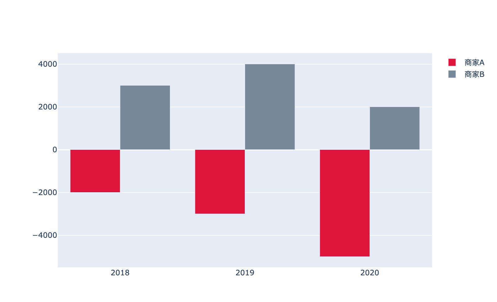 import plotly.graph_objects as goyears = ['2018','2019','2020']fig = go.Figure()fig.add_trace(go.Bar(x=years, y=[2000, 3000, 5000],# base另一种写法:np.array([2000, 3000, 5000]) * (-1)base=[-2000,-3000,-5000], # 基准设置marker_color='crimson',name='商家A'))fig.add_trace(go.Bar(x=years, y=[3000, 4000, 2000],base=0, # 默认基准设置marker_color='lightslategrey',name='商家B'
