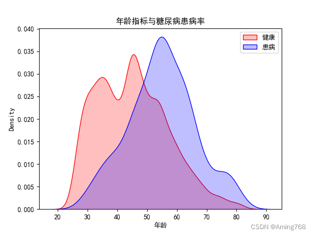 for col in data1.columns:dt = data1[col]fig0 = sns.kdeplot(data0[col], shade=True, color="r", label='健康')fig0.legend(loc='upper right')fig1 = sns.kdeplot(data1[col], shade=True, color="b", label='患病')fig1.legend(loc='upper right')plt.title(col + '指标与糖尿病患病率')plt.show()