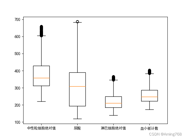 data = pd.read_csv("Path",engine='python',encoding='ANSI',usecols=[4, 5, 6, 7]) # 需要画箱型图的数据列