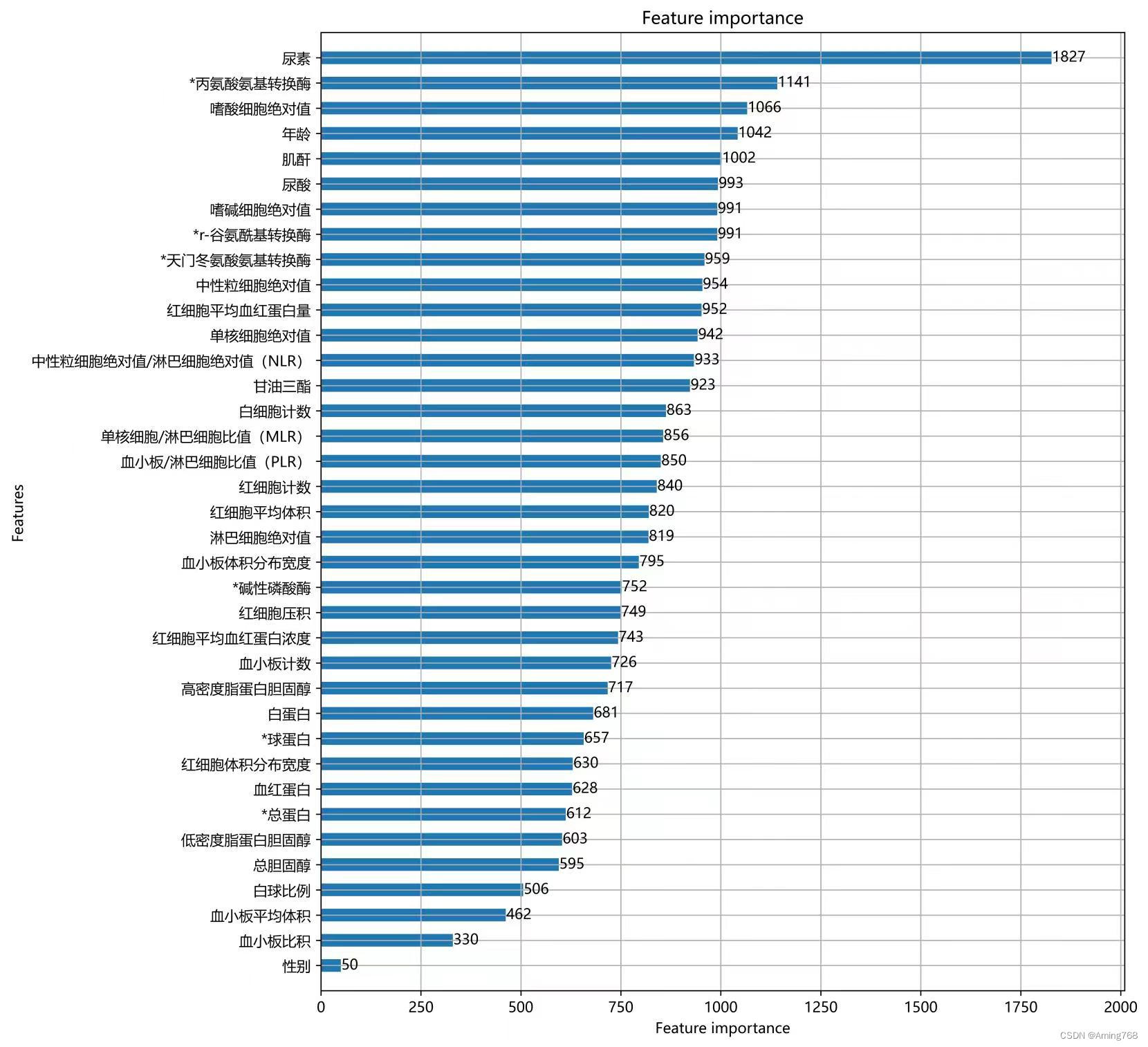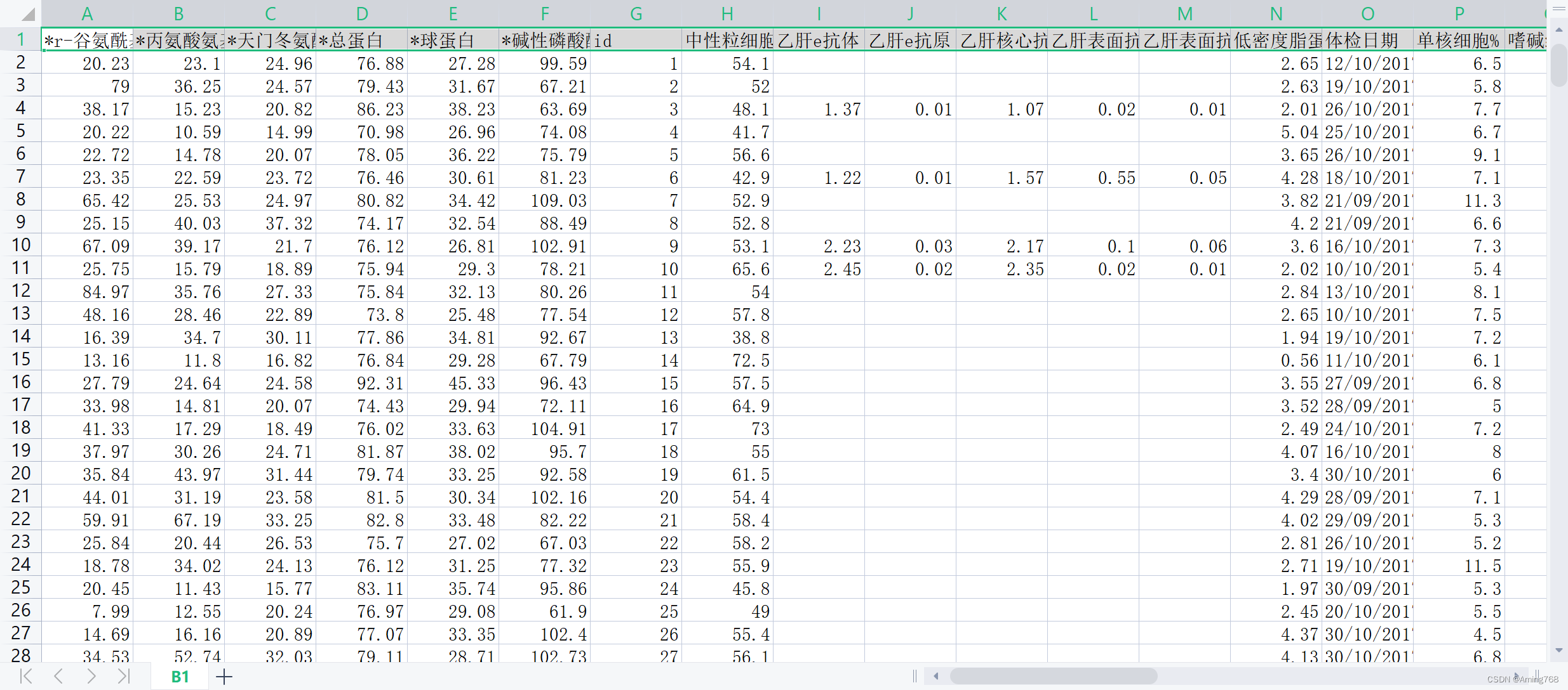 附件一包含的特征值:*r-谷氨酰基转换酶 *丙氨酸氨基转换酶 *天门冬氨酸氨基转换酶 *总蛋白 *球蛋白 *碱性磷酸酶 id 中性粒细胞% 乙肝e抗体 乙肝e抗原 乙肝核心抗体 乙肝表面抗体 乙肝表面抗原 低密度脂蛋白胆固醇 体检日期 单核细胞% 嗜碱细胞% 嗜酸细胞% 尿素 尿酸 年龄 性别 总胆固醇 淋巴细胞% 甘油三酯 白球比例 白细胞计数 白蛋白 红细胞体积分布宽度 红细胞压积 红细胞平均体积 红细胞平均血红蛋白浓度 红细胞平均血红蛋白量 红细胞计数 肌酐 血小板体积分布宽度 血小板平均体积 血小板比积 血小板计数 血糖 血红蛋白 高密度脂蛋白胆固醇