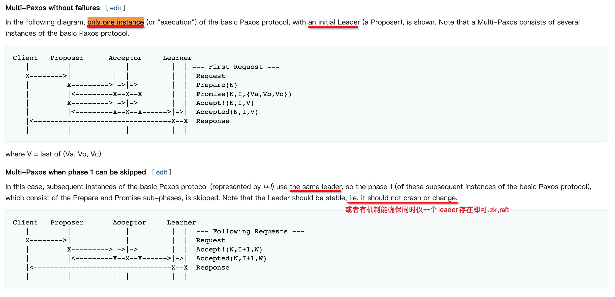 正常操作下,一个服务器被选择为leader,它就是所有的paxos实例(instance)的主proposer( 唯一能够提出提议的[译者注98, 本文论文这里提到的leader尽量唯一但不强求, 提交议案时需要进行两阶段的提交. ] [与现在的zab/raft区别是, zab/raft的leader都是先选主且必须唯一, 且后续提交时仅一阶段即可] )。