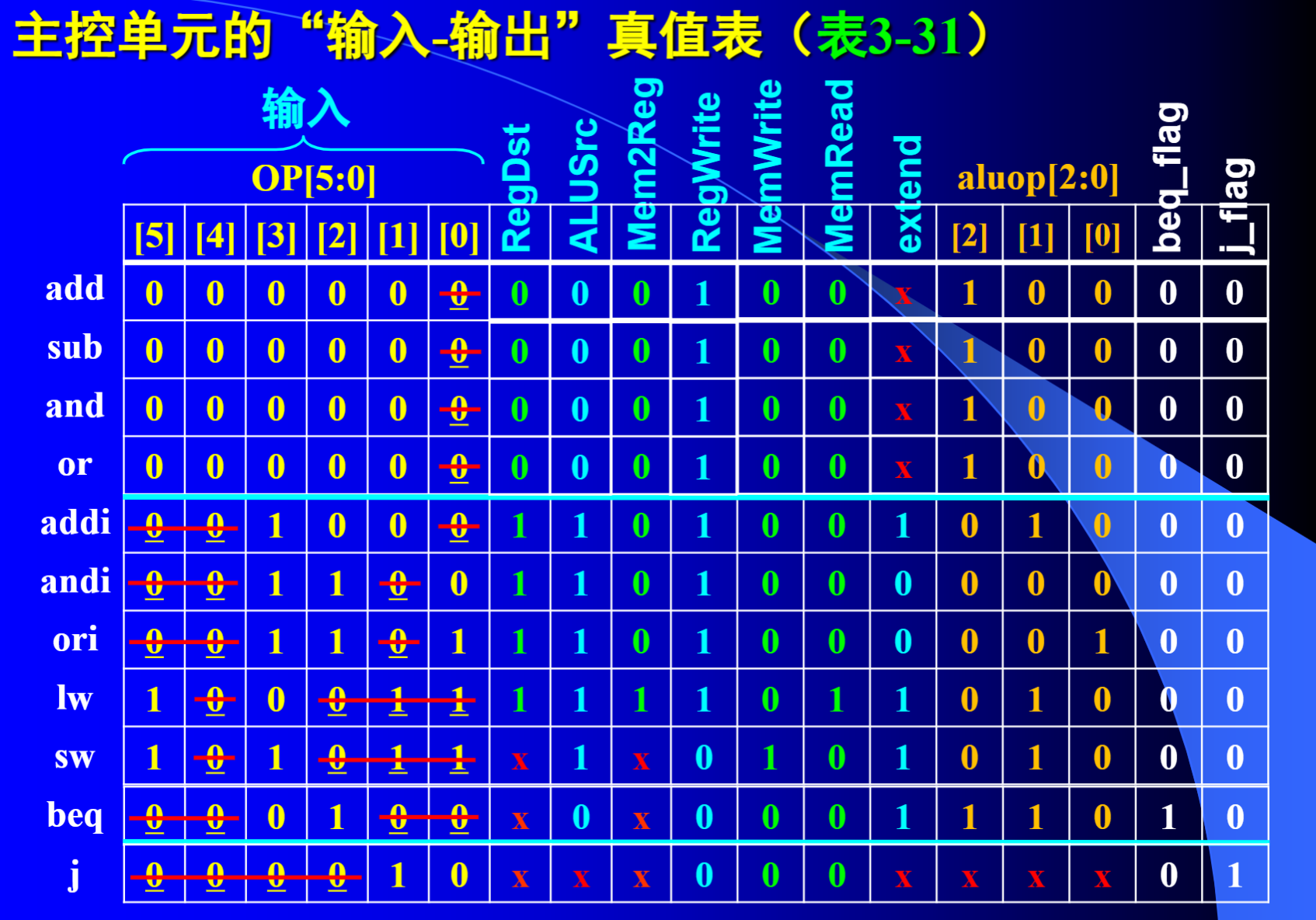 主控单元接收的唯一输入就是指令中的操作码OP,即Inst[31:26],对OP译码后,输出7种直接控制信号和3种间接控制信号。