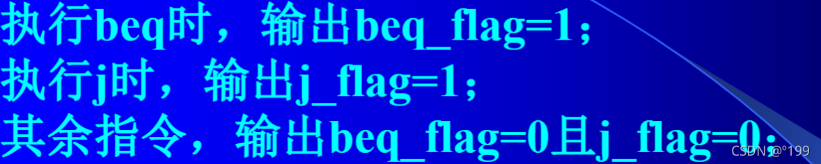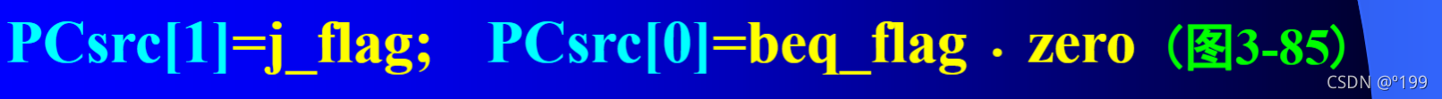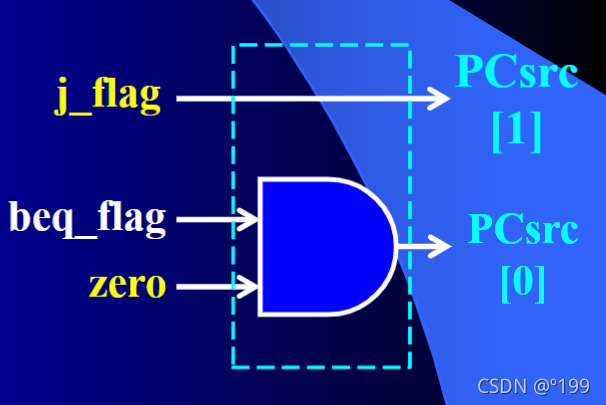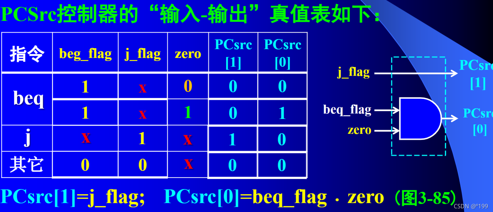 输出位PCSrc[1]与j_flag一致,所以两者在逻辑上是同一关系,即j_flagPCSrs[1]。只有当从主控单元输入到PCSrc控制单元的beg_flag=1且ALU反馈输入的标志位zero=1时,PCSrc控制单元输出位PSCrc[0]=1,其余情况输出的PCSrc[0]=0。