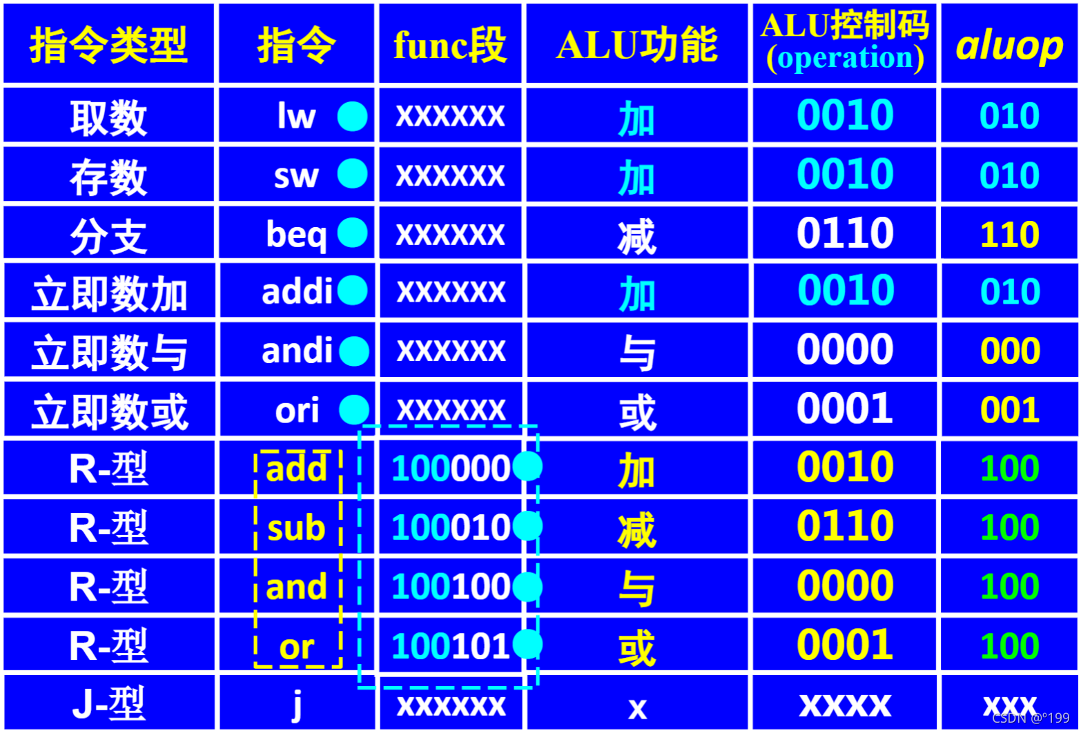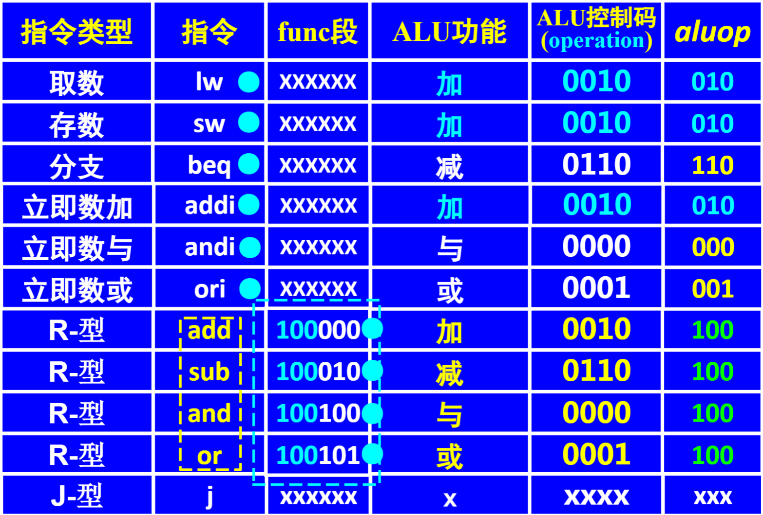 R型指令的操作码OP全是0,它们可以靠func来说明执行何种运算操作,因而ALU控制单元根据aluop和func来确定输出的operation,即