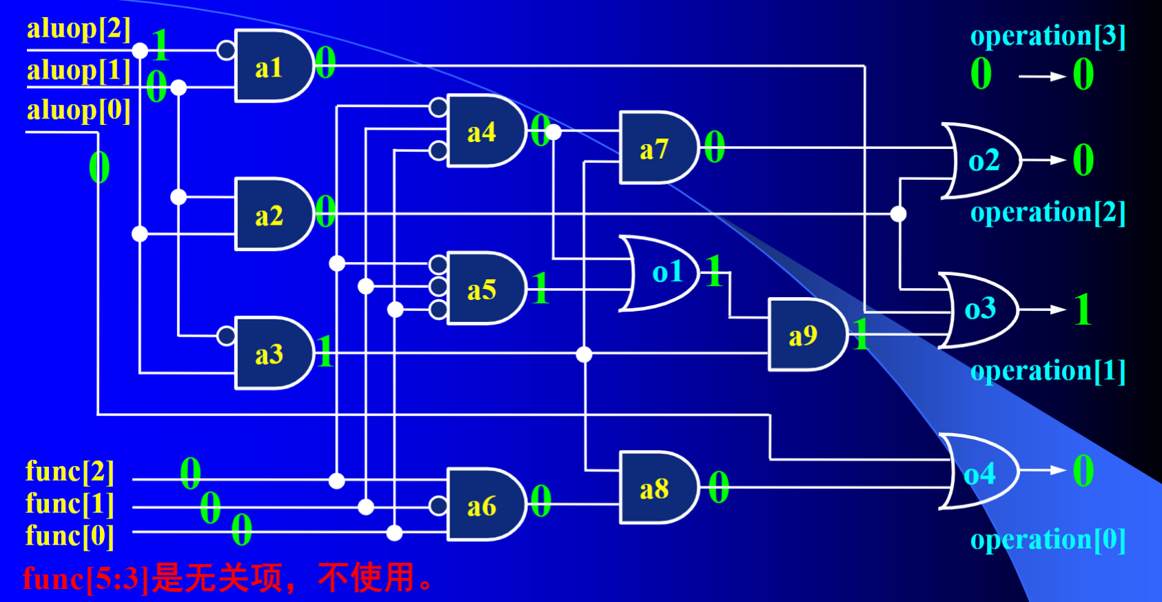 aluop[2:1]=10时可以判断是执行的R型指令,再结合输入的func[2:0],就可以确定唯一的operation输出,即,则aluop[0]和func[5:3]与输出的operation无关,组合逻辑中无需考虑这些无关项。
