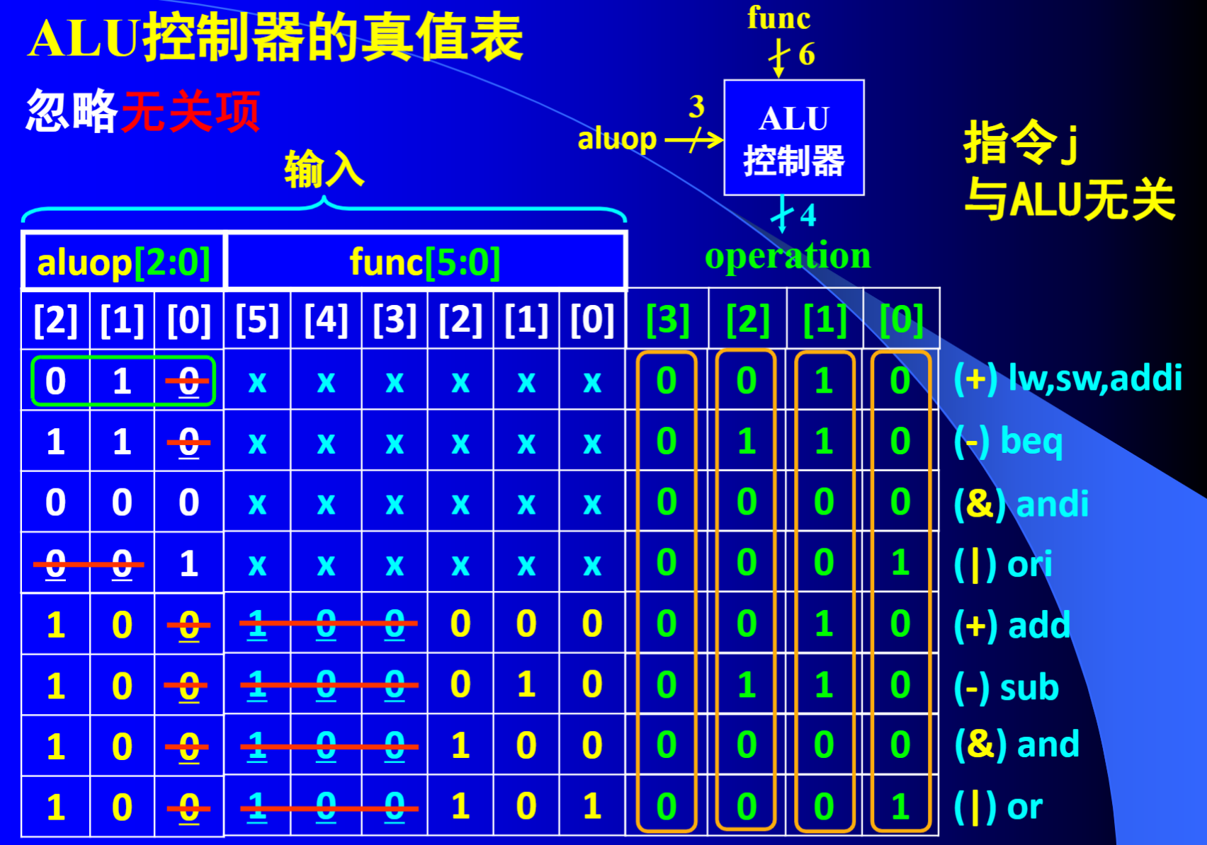 J型指令不会使用ALU,所有ALU控制单元输出的operation与J型质量无关,所有的无关项可以标记为 。