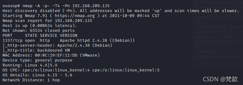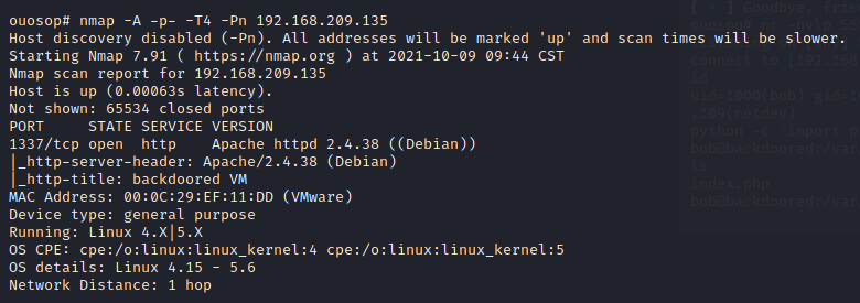 使用nmap 针对主机进行端口探测 仅出现1337端口为http服务