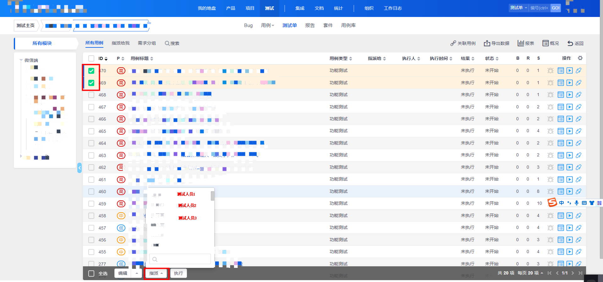 a、勾选用例,点击下方的指派,选择将用例指派给某个人员