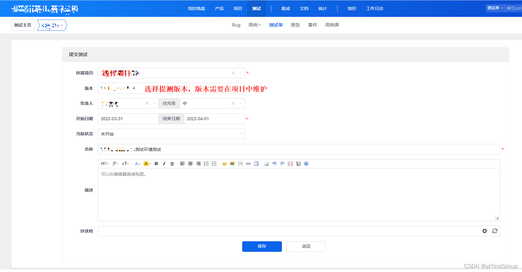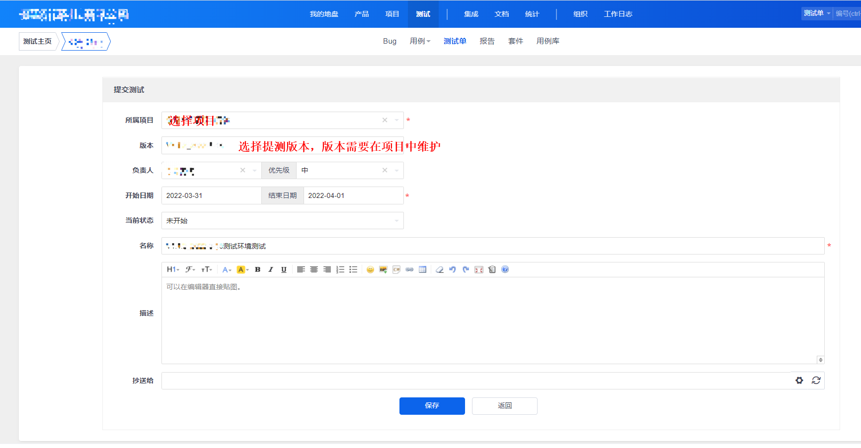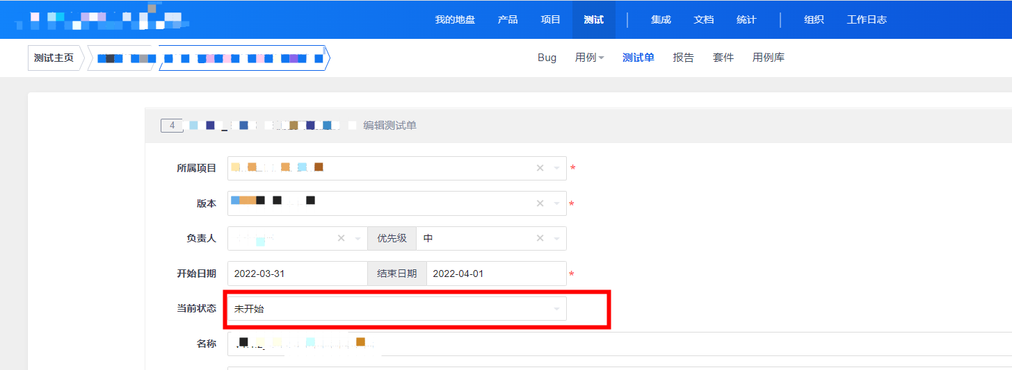 b、选择项目、版本、负责人、开始日期、结束日期、名称