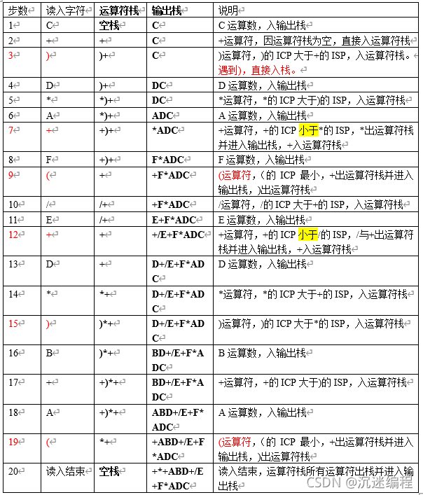总结:遇到’)’直接读入运算符栈,入栈后’)’变为最小的ISP,后续的运算符(除了’)’外)都可以直接读入。