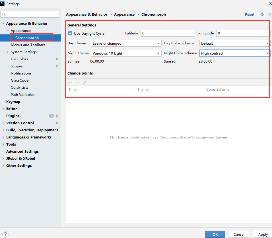 只需在 Settings -> Appearance & Behavior -> Appearance -> Chronomorph 下指定一个或多个更改点,然后让插件自动应用适当的主题和配色方案。