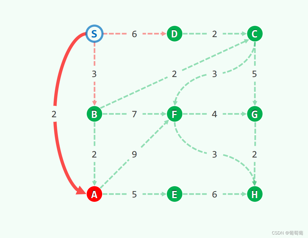 把一个无向带权图可以制作成一个物理模型:节点用小球表示,带权的边用长度等于权的绳子连接,然后用一个带磁力的黑板能吸住小球,将源球放在黑板最上端。不断上移源球。随着源球的上升(过程忽略水平距离,而且一开始所有球都处于黑板最上端,即所有球在同一水平线,下图只是为了表达清晰各个球之间的距离),首先脱离黑板的应该是A球,在s球上升2之后,接下来脱离黑板的球应该是min(到s球距离,到A球距离+2)最小的那个球,也就是再上升一个高度,s球高度达到3,B球离开。注意此时AB之间的绳子是松的,长度为2,但是AB距离为1,而且一直是松的。接下来的判断与此类似。这样将所有球都拉出,每个球的最短路径长度就是距离s球的距离,最短路径就是拉直的绳子。为什么这种拉绳子的结果是正确的呢?首先只要是有路径到达的点,一定存在最短路径,而且路径上点一定也是最短路径,所以,从一开始就迭代的方式是对的。注意将所有最短路径取并(即将所有拉伸的绳子),是一个无环连通的树,因此通过PFS框架做过dijkstra算法后,相应的边变为树边,树上所有节点的路径即使最短路径。