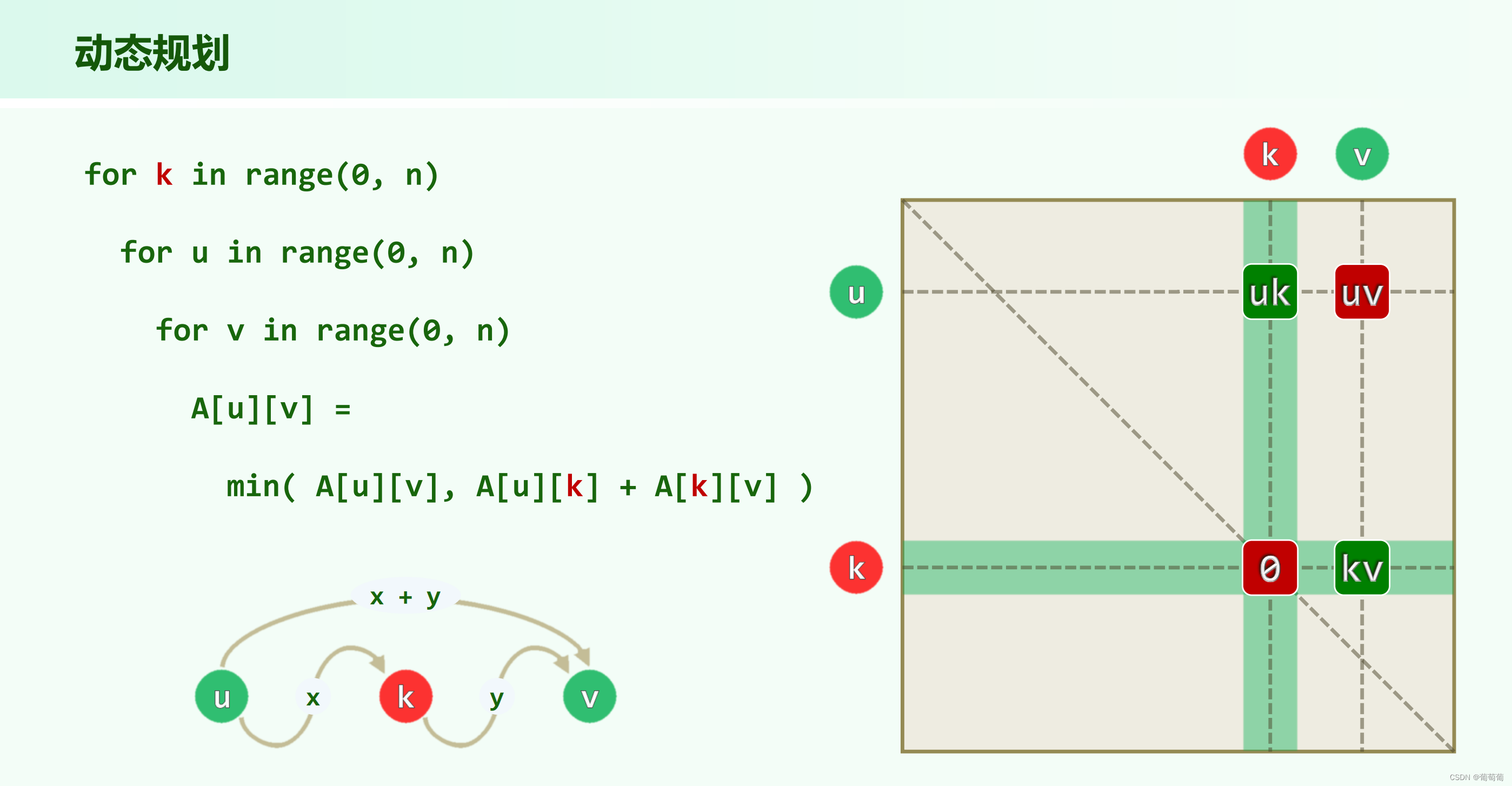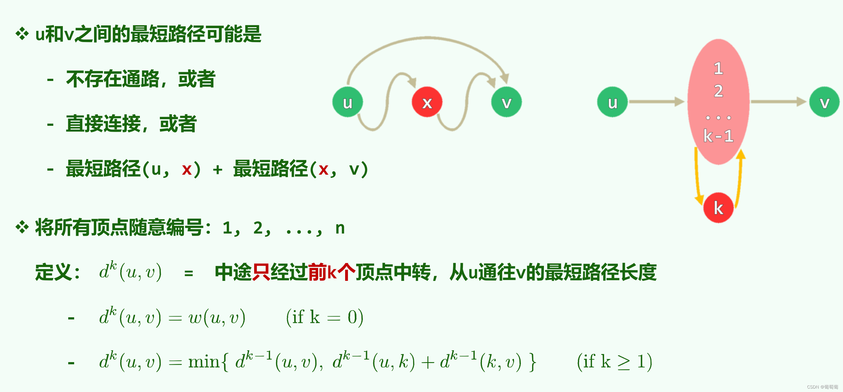 d k(u,v)可以递归计算,d n(u,v)即是u与v之间的最短距离,蛮力递归需要极长时间(指数级),原因是存在很多重复的递归实例。(想起了fibnacci数的计算,蛮力递归也是很多重复的递归调用,解决办法是重头开始,用表记录每个fibnacci数)