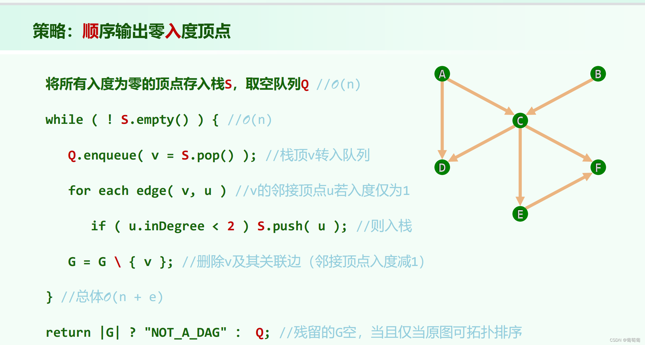 概念:考虑这样一个现象,学习课程有先修课(如果A是B的先修课,那用图表示就是A指向B,每个节点表示课,边表示是否有先修关系),那么一系列课程以及其先修关系可以用图表示。拓扑排序的对象是针对这些课程(即图中的节点),需要满足的要求是,每个课程的先修课程一定要在排在该课程之前(每个节点的先驱节点要排在节点之前)。注意如果图中有环,那么将无法用线性的方式对构成环的节点排序,所以只有DAG(directed acyclic gragh)有向无环图才存在拓扑排序。(而且有向无环图一定可以进行拓扑排序)