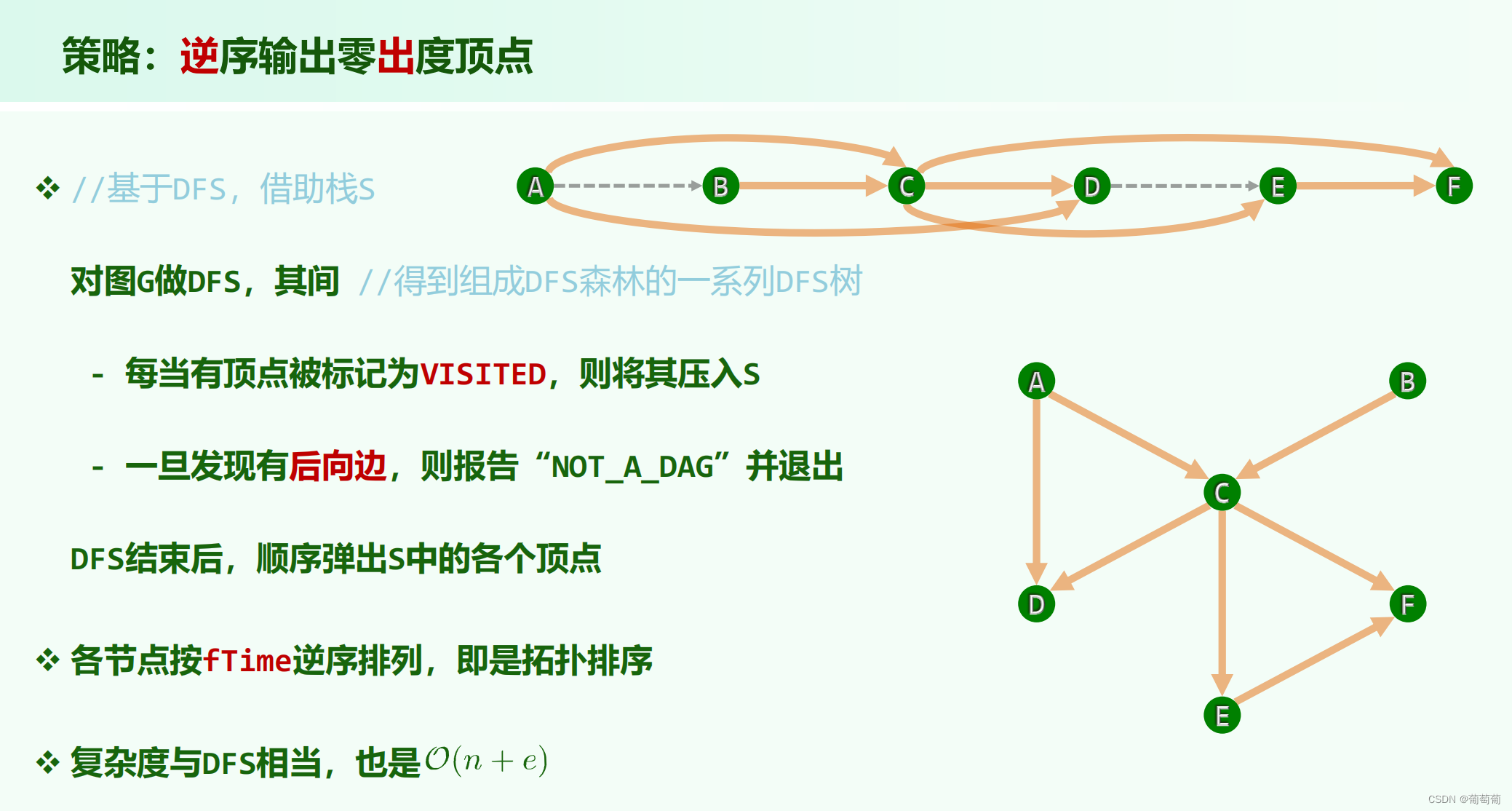 要实现拓扑排序,可以有两种思路,一种是不断将0入度的顶点排序(排完将其删除,然后将删除后入度为0的点加入待排序的栈),如果最后没有删除干净,说明不是DAG,如果是输出队列即可。另一种思路,将0出度的顶点压入栈然后逆序输出,每压入栈就等效于删除了该点,再将0出度的压入栈。其实这种用DFS(更准确是dfs全图)即可,一旦visited即压入栈,如果有backward边说明不是DAG。Stack<Tv>* tSort( Rank ); //基于DFS的拓扑排序算法,tsort针对全图,rank值取什么值对结果没影响。bool TSort( Rank, Rank&, Stack<Tv>* ); //(连通域)基于DFS的拓扑排序算法。