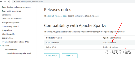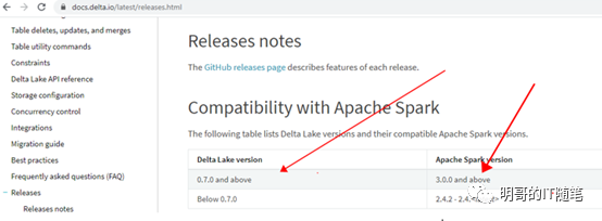 注意:delta lake 和 spark各版本的兼容性,如官方下图所示: