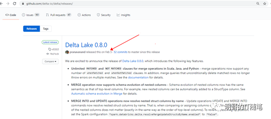 在2021/02/05, delta lake 发布了0.8.0版本,如下图所示: