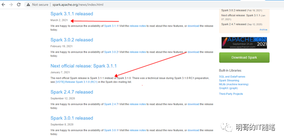 同时在2021/03/02,spark 发布了3.1.1版本,如下图所示:(spark 3.1系列的第一个正式版本是3.1.1,而不是3.1.1,如下图所示):