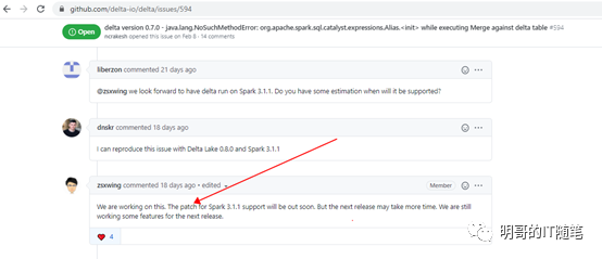该issue下还有详细描述,通过仔细查看发现,该问题的原因是 delta lake 0.8.0发布时,spark3.1.1还未正式对外发布,所以没有办法测试二者的兼容性;后续delta 会在0.8.0的基础上,针对跟spark3.1.1的该兼容性问题,出一个patch release,我们只需要耐心静待一段时间就好了。