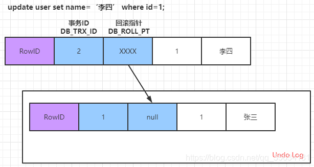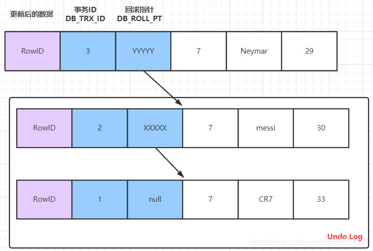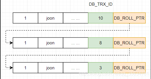DB_ROLL_PTR:回滚指针,指向 undo log 记录。每次对某条记录进行改动时,该列会存一个指针,可以通过这个指针找到该记录修改前的信息 。当某条记录被多次修改时,该行记录会存在多个版本,通过DB_ROLL_PTR 链接形成一个类似版本链的概念。