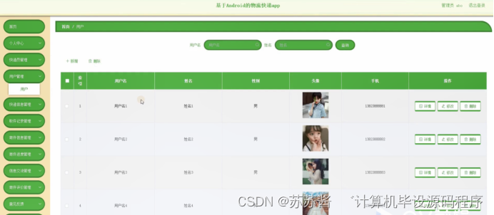 用户管理,在用户管理页面可以对索引,用户名,姓名,性别,头像,手机等内容进行详情,修改或删除等操作,如图5-10所示。
