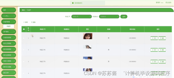 快递员管理,在快递员管理页面可以对索引,快递工号,快递姓名,照片,性别,联系电话等内容进行修改和删除操作,如图5-11所示。