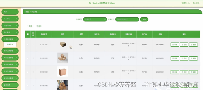 快递信息管理,在快递信息管理页面可以对索引,快递单号,照片,位置,取件码,快递状态,到柜时间,用户名,手机等内容进行详情,修改或删除操作,如图5-12所示。
