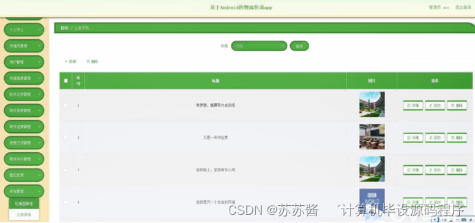 系统管理,在公告资讯页面可以对索引、标题、图片等内容进行详情,修改或删除等操作,还可对轮播图管理进行详细操作,如图5-16所示。