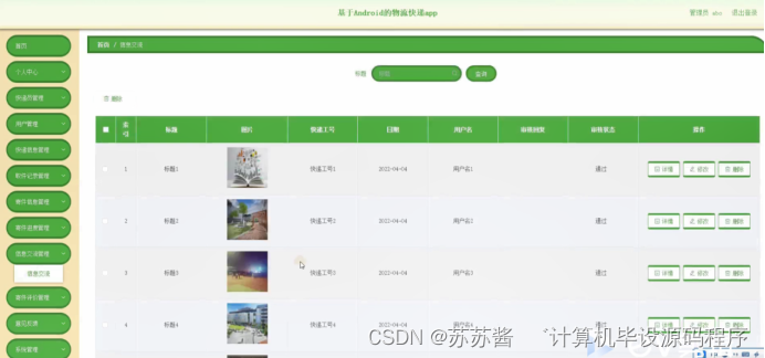 信息交流管理,在信息交流管理页面可以对索引,标题,图片,快递工号,日期,用户名,审核回复,审核状态等内容进行详情,修改和删除操作,如图5-14所示。
