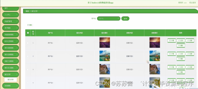 意见反馈,在意见反馈页面可以对索引,用户名,留言内容,留言图片,回复内容,回复图片等内容进行详情,修改和删除操作,如图5-15所示。