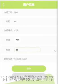 快递员信息,在快递员信息页面通过填写快递工号,密码,快递姓名,照片,性别,联系电话等信息进行保存或退出登录操作,如图5-7所示。
