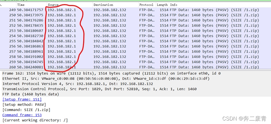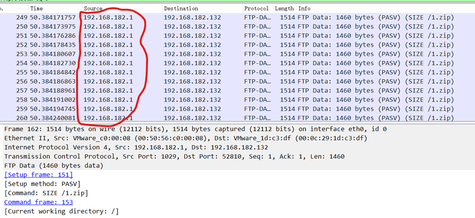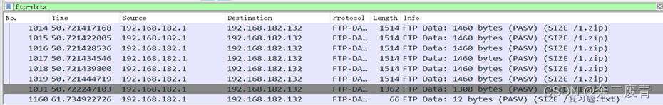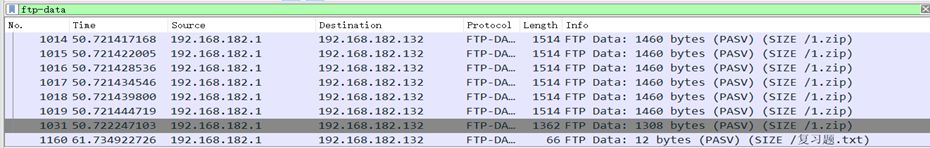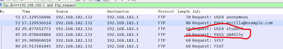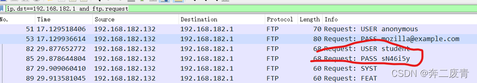 输入过滤语句ip.dst==192.168.182.1 and ftp.request