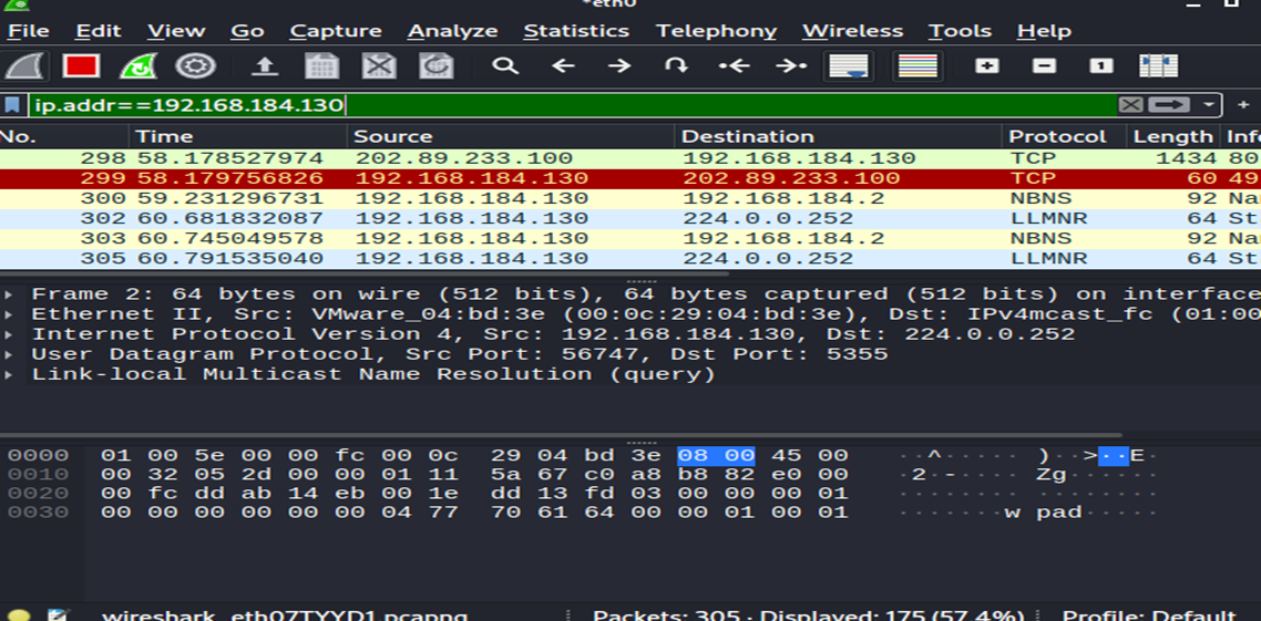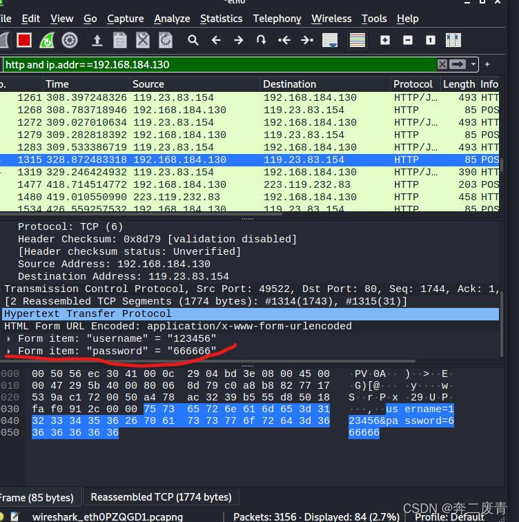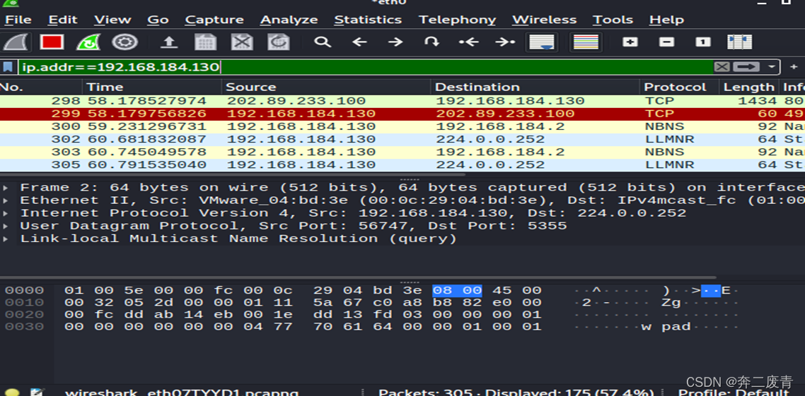 输入ip.addr==192.168.184.130(所攻击的IP地址)