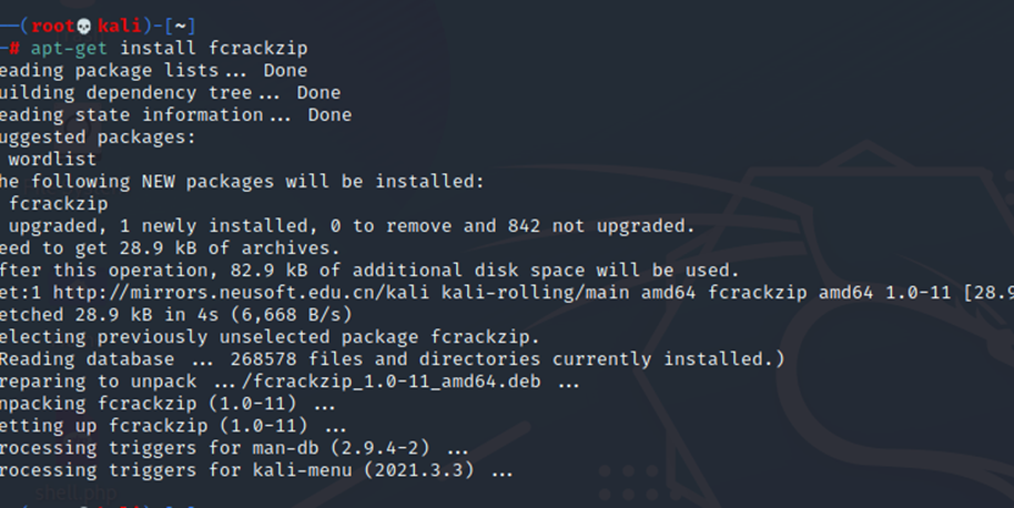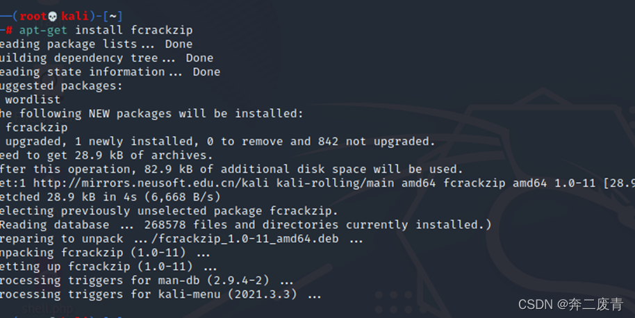 打开kali终端输入口令apt-get install fcrackzip 安装