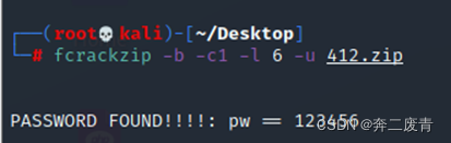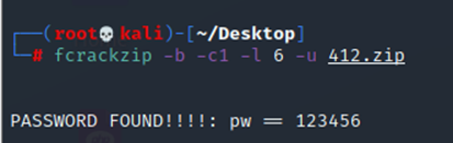 然后输入命令fcrackzip -b -c1 -l 6 -u 412.zip