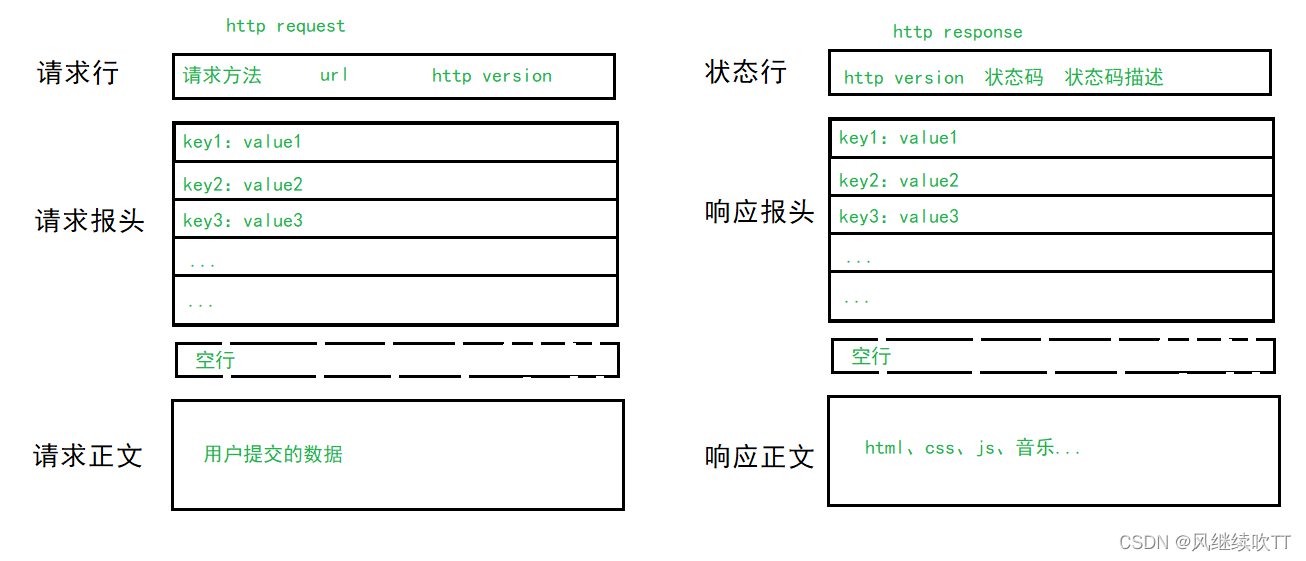 其中请求行(状态行)和请求报头(响应报头)被统称为http报头,而请求正文(响应正文)被称为有效载荷。