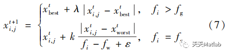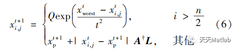 式(6)中:xp为生产者占据的最佳位置;xworst为全局最差位置;A为1×d阶矩阵,每个元素随机为1或-1;A†=AT(AAT)-1。当i>时,表示适应性较差的第i个加入者抢夺食物失败,为了更好地获得食物避免挨饿只能飞往其他地区进行觅食。总体而言,假设意识到危险的麻雀(即警戒者)占10%~20%。初始位置则随机产生,规则为
