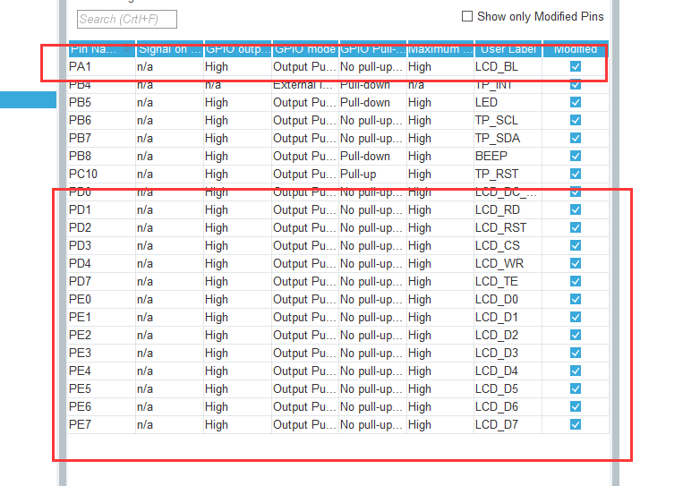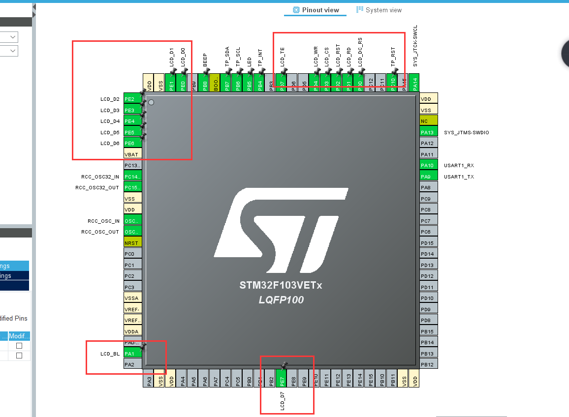 接下来,我们重点配置一下 GPIO,这里因为考虑到数据位为 8位数据脚,为了方便,最好分配一组GPIO,用寄存器操作来写入数据,这样会方便 (这里我们分配 PE组 0 --- 7号引脚作为引脚分配:)
