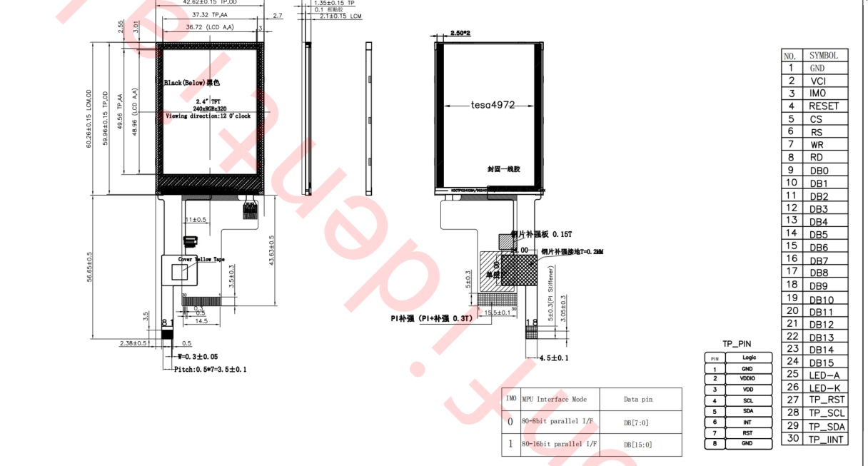 LCD屏幕: 驱动IC ST7789 8/16位并口屏 (此处因考虑到GPIO资源限制我们把IM0接GND,选用8位)