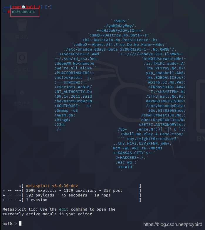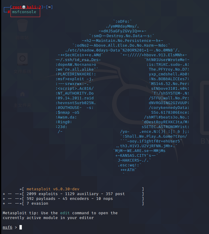 第一步:在打开的kali中启动MSF框架。直接输入msfconsole回车进入