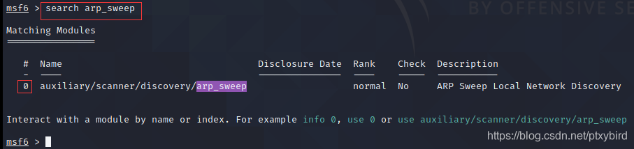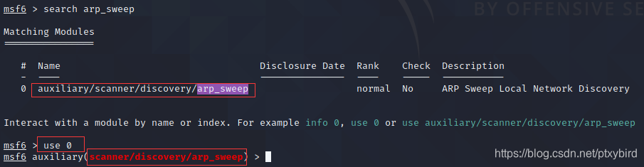 第三步:使用arp_sweep模块进入该模块(即图中红色代码),use+空格+对应模块前的序号,或use+空格+模块名