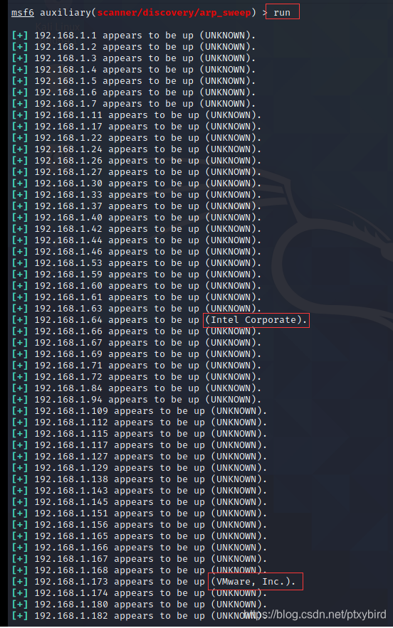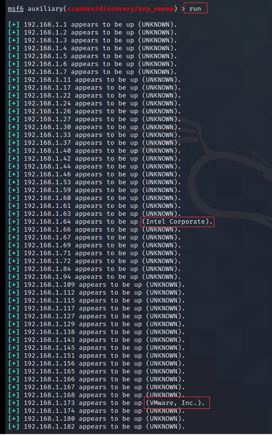 从返回结果可以看到,arp_sweep模块很快发现了192.168.1.0/24网段上拥有如上图这么多台活跃主机,其中192.168.1.173这个IP地址为宿主主机上模拟的虚拟网卡IP地址。