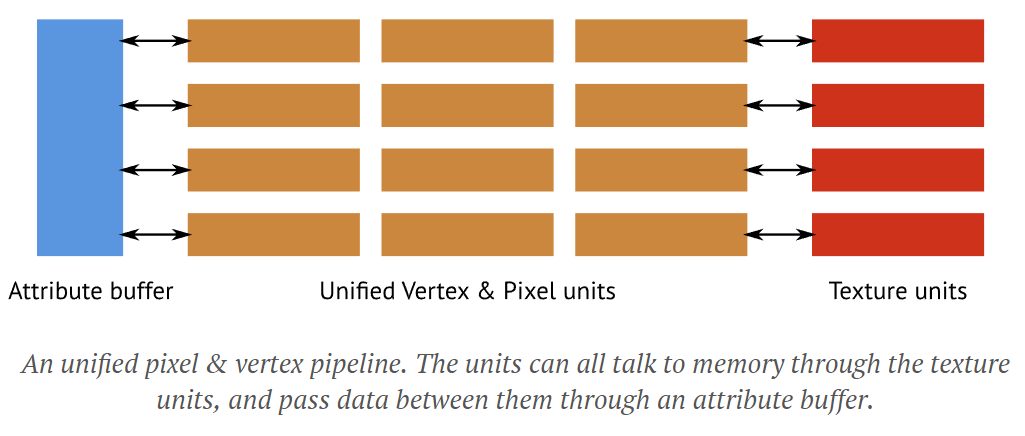 However, a fixed distribution also makes it impossible to load-balance resources. As games evolved, sometimes more vertex power was required -- for instance, when rendering dense geometry like trees -- while other games were exploiting the new shader programming models to write more complex pixel shaders. This was also the time at which GPGPU programming starting, that is, programmers were trying to solve numerical programs on GPUs. Eventually, it became clear that the fixed split was not good enough.