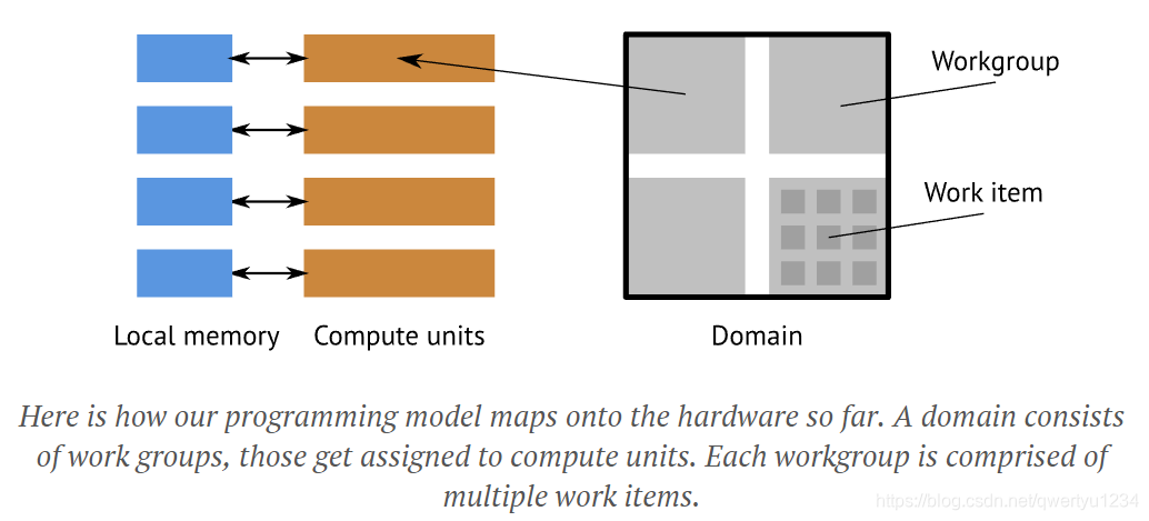 The goal is to write a programming system which allows us to take advantage of the hardware at hand. Obviously, the first thing we notice is that cross-compute-unit communication is something we want to avoid. All of the compute units are clients of the L2 cache, but clearly the L1 caches can go out of sync, so if we distribute work, we should pretend we can't talk across compute units. This means that we somehow have to split our work into smaller units. We could go just pretend there are no compute units and dispatch individual items, but then we're missing out on the local memory, so it seems that we want one level below "here's all work".