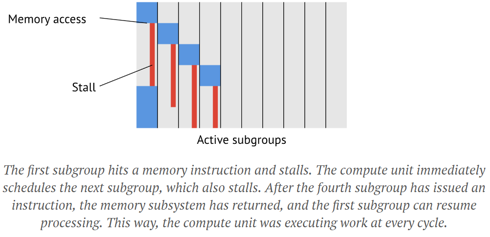 The way a GPU hides latency is by having more work in flight. A lot more work -- taking GCN again as the example, every compute unit can have up to 40 subgroups in flight. Every time a subgroup accesses memory, another one gets scheduled in. Given only four can execute at the same time, this means we can switch up to 10 times before we return to the subgroup which started the original request.