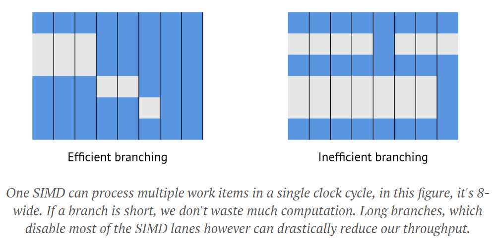 Which means that for a SIMD of length N, we can get a worst-case usage of 1/N. On CPUs N is usually 1..8, so it's not catastrophic, but on a GPU N can be as high as 64 at which point this does really matter. How can we make sure this doesn't happen? First, we can take advantage of the subgroup execution; if we have a branch to select between a cheap and expensive version, and some work items take the expensive version, we might as well all take it. This reduces the cost of a branch from expensive + cheap to just expensive. The other part is to simply avoid excessive branching. As CPUs get wider, this is also becoming more important, and techniques like sorting all data first, and the processing it become more interesting than heavy branching on individual work items. For instance, if you're writing a particle simulation engine, it's much faster to sort the particles by type, and the run a specialized program for each, compared to running all possible simulation programs for each particle.